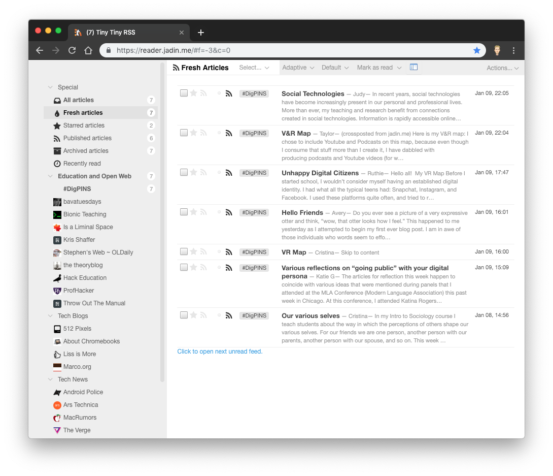 This semester I’ve been fortunate enough to be able to teach a tutorial class with 10 honors students on Digital Citizenship. Here is my course site: digciz.jadin.me