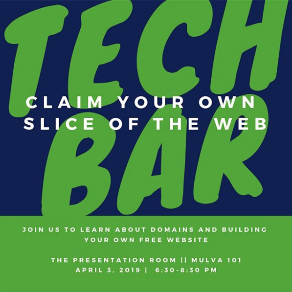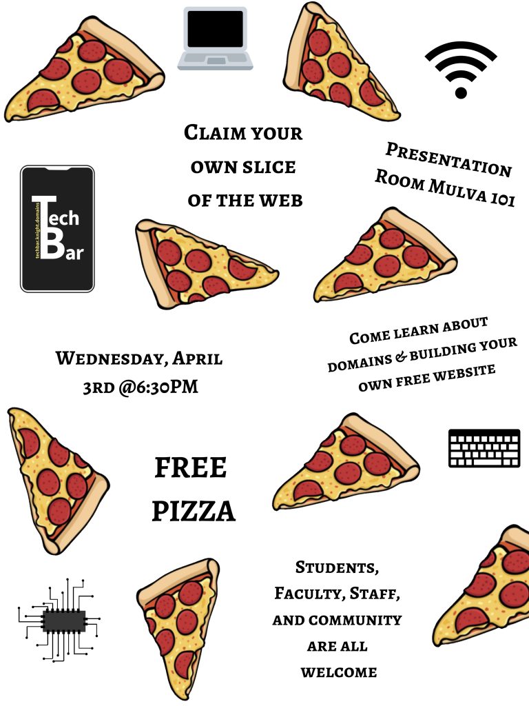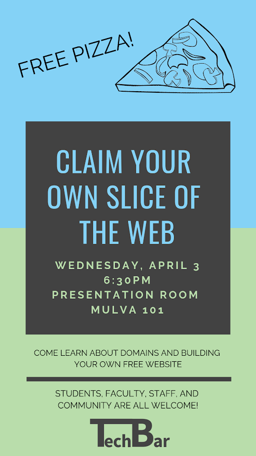 I’m really proud of the work our Tech Bar students have been doing promoting their next event on campus called “Claim Your Own Slice of the Web.” Yes, the pun is intended.
