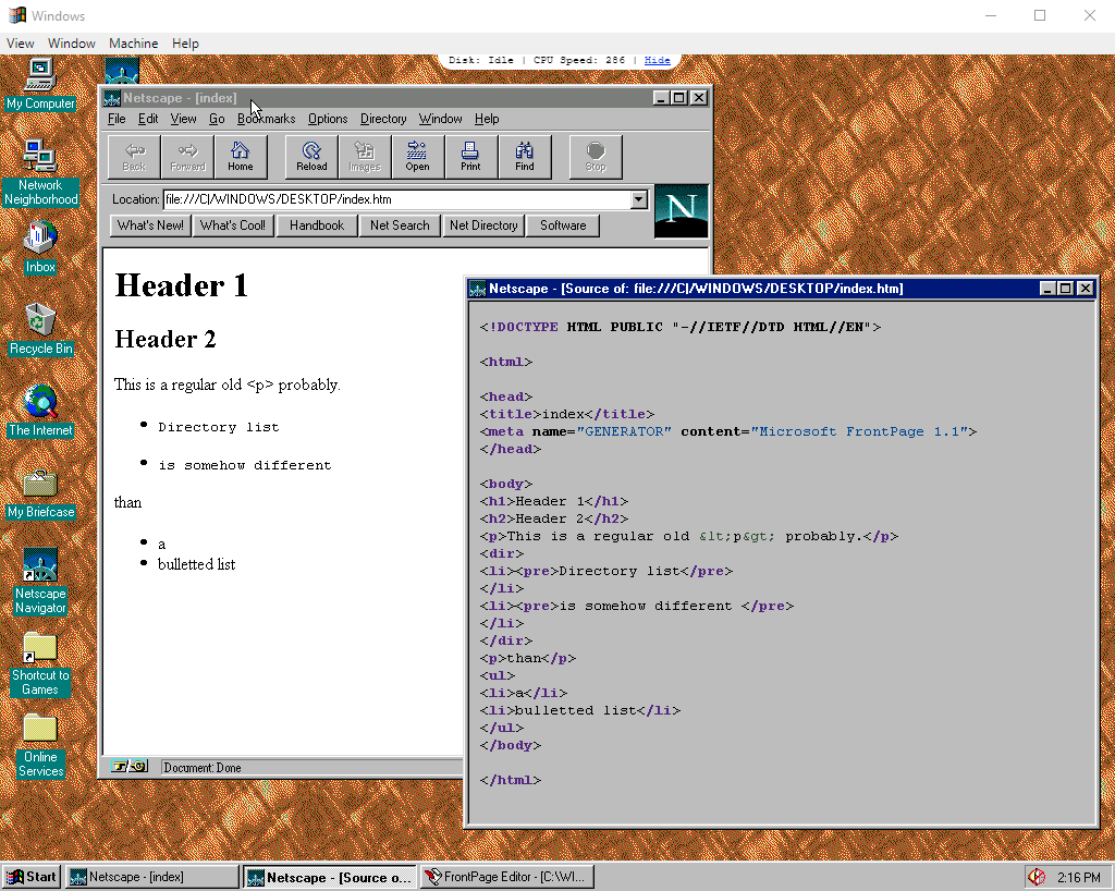 I fired up FrontPage and saved an index.html[3] then opened it up in Netscape and viewed the source: